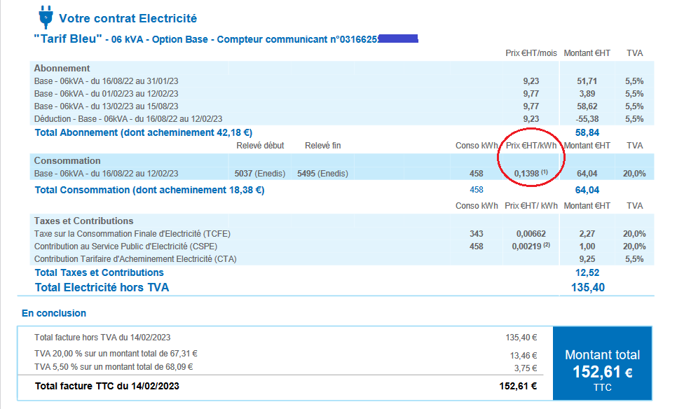 Pour connaitre le prix du kilowattheure, regardez sur votre facture d’électricité. Celui-ci est indiqué en clair comme sur la facture ci-dessous qui date de 2023.