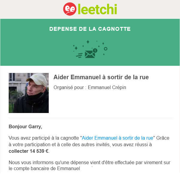 Lorsque j’ai vu le montant après quelques jour , je me suis acclamé: « ça y est, Emmanuel est sorti définitivement de la rue! »