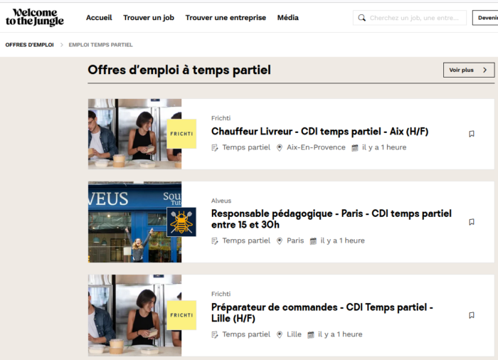 Welcome to the jungle: Même si le titre est en français, il s’agit bien d’une entreprise française ciblant un large public. Là aussi, n’oubliez pas de stipuler « temps partiel » dans la barre de recherche.
